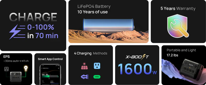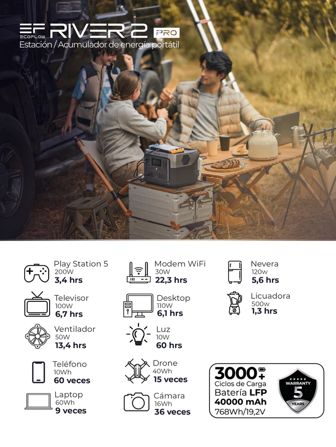 Con la mejora en la batería LFP, su química permite cargar la River 2 Pro hasta 3000 veces. Eso es bastante, 10 años cargando a diario, es 6 veces más que el promedio de la industria. Con celdas LFP la serie River 2 es segura, durable, altamente eficiente incluso en climas extremos o altas temperaturas.
