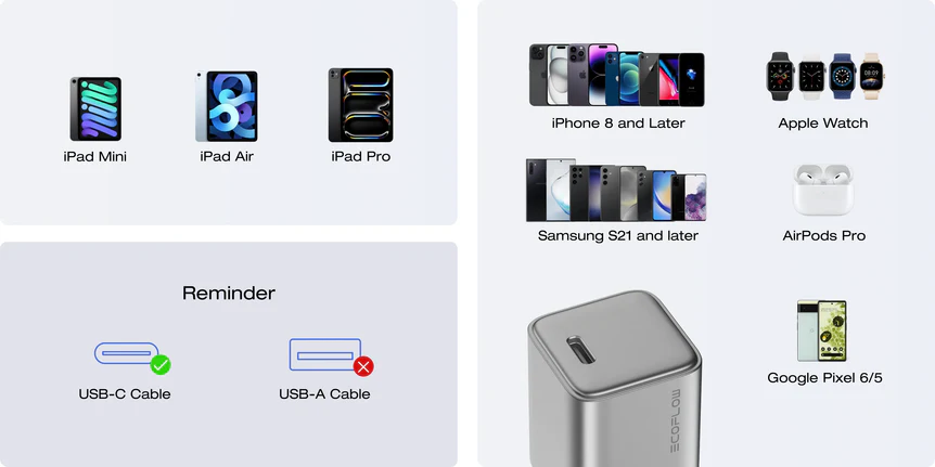¡Carga tu iPhone a la velocidad de la luz con el Cargador GaN EcoFlow! Con su diseño compacto, es un 40% más pequeño que los cargadores estándar y cabe fácilmente en un bolsillo o bolso. Además, es compatible con teléfonos, accesorios y tabletas de marcas como Apple, Samsung y Google. ¡Obtén una carga rápida y eficiente en cualquier lugar!