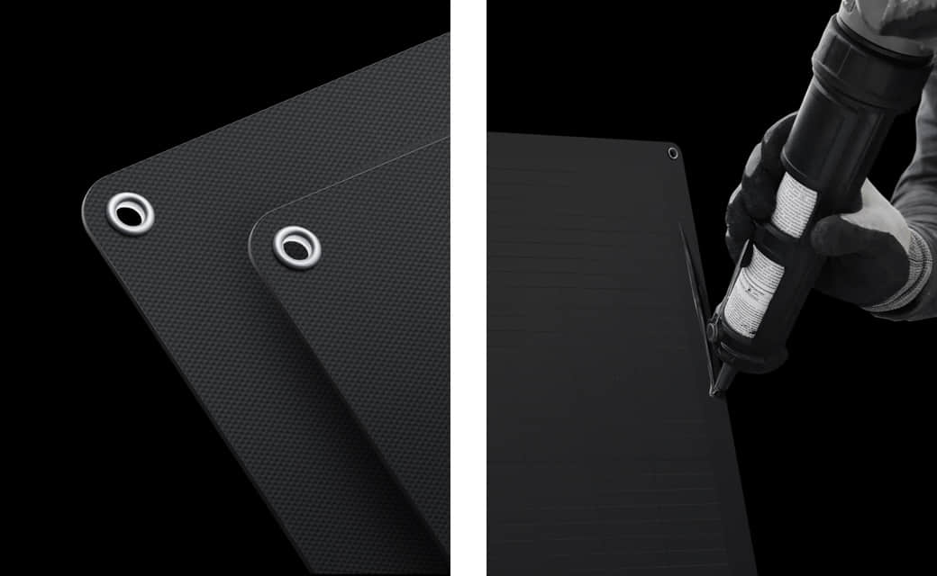 Con ojales precortados, el panel solar flexible se puede colgar con ganchos o se puede fijar de forma segura a una superficie con un adhesivo.
