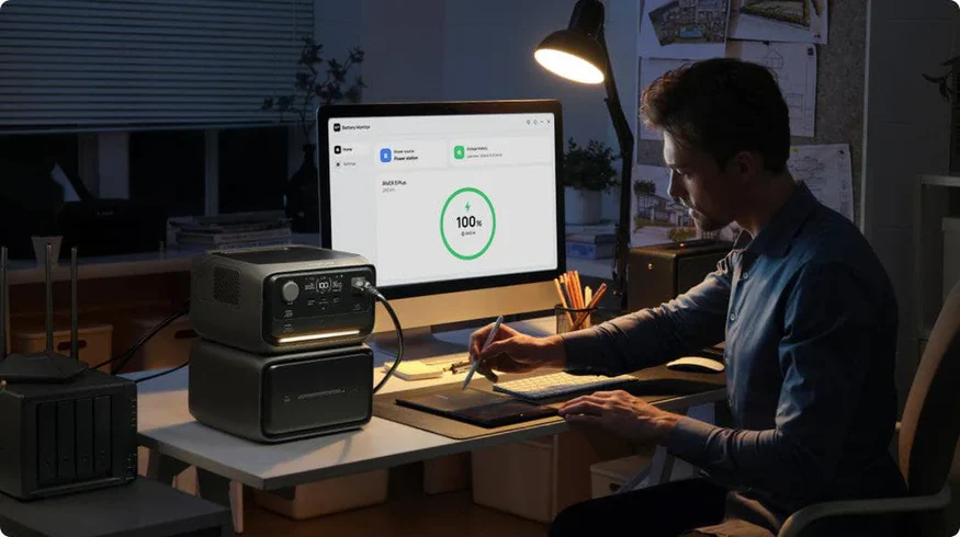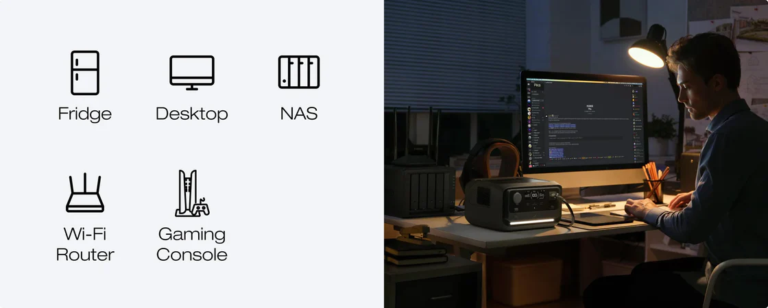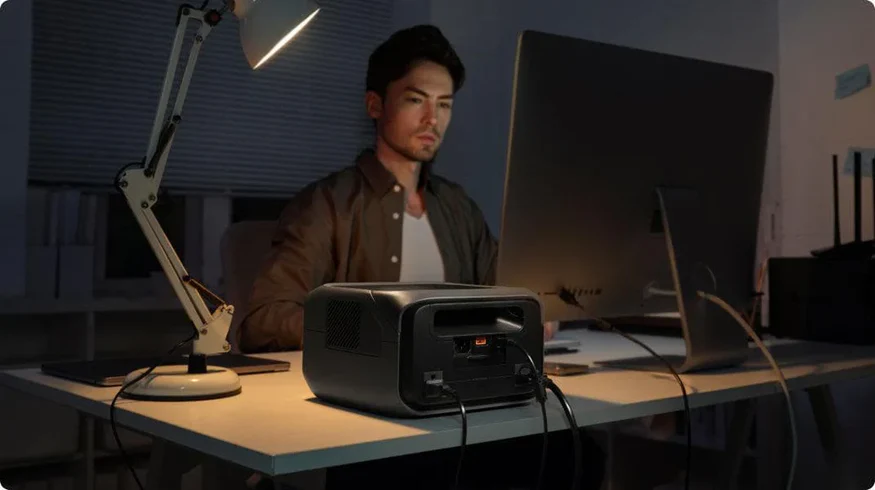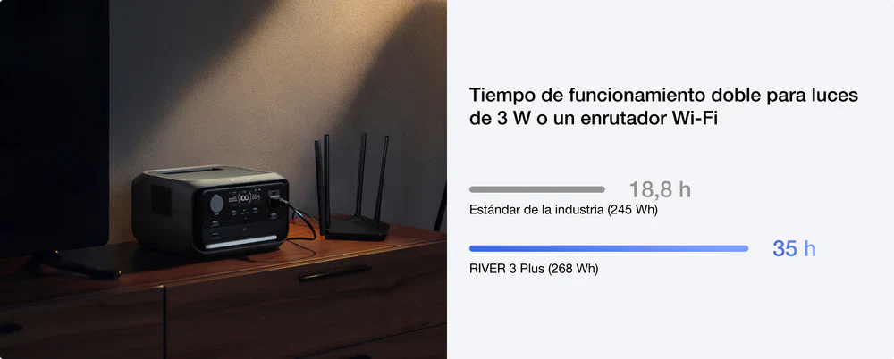 Equipado con una capacidad de 268 Wh y una salida de 600 W, RIVER 3 Plus puede suministrar energía a un enrutador con Wi-Fi de 3 W Wi-Fi hasta por 35 h. Además, puede hacer funcionar correctamente cualquier dispositivo de oficina, incluidas las computadoras de 600 W durante al menos 21 minutos, lo que permite un apagado seguro y el término de las tareas en curso.