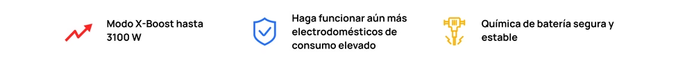 - CA (6 uds.) Onda sinusoidal pura, 2400 W totales (máximo: 3400 W), 100-200V~ (50 Hz/60 Hz) Potencia máxima de los dispositivos compatibles con X-Boost: 3400W.