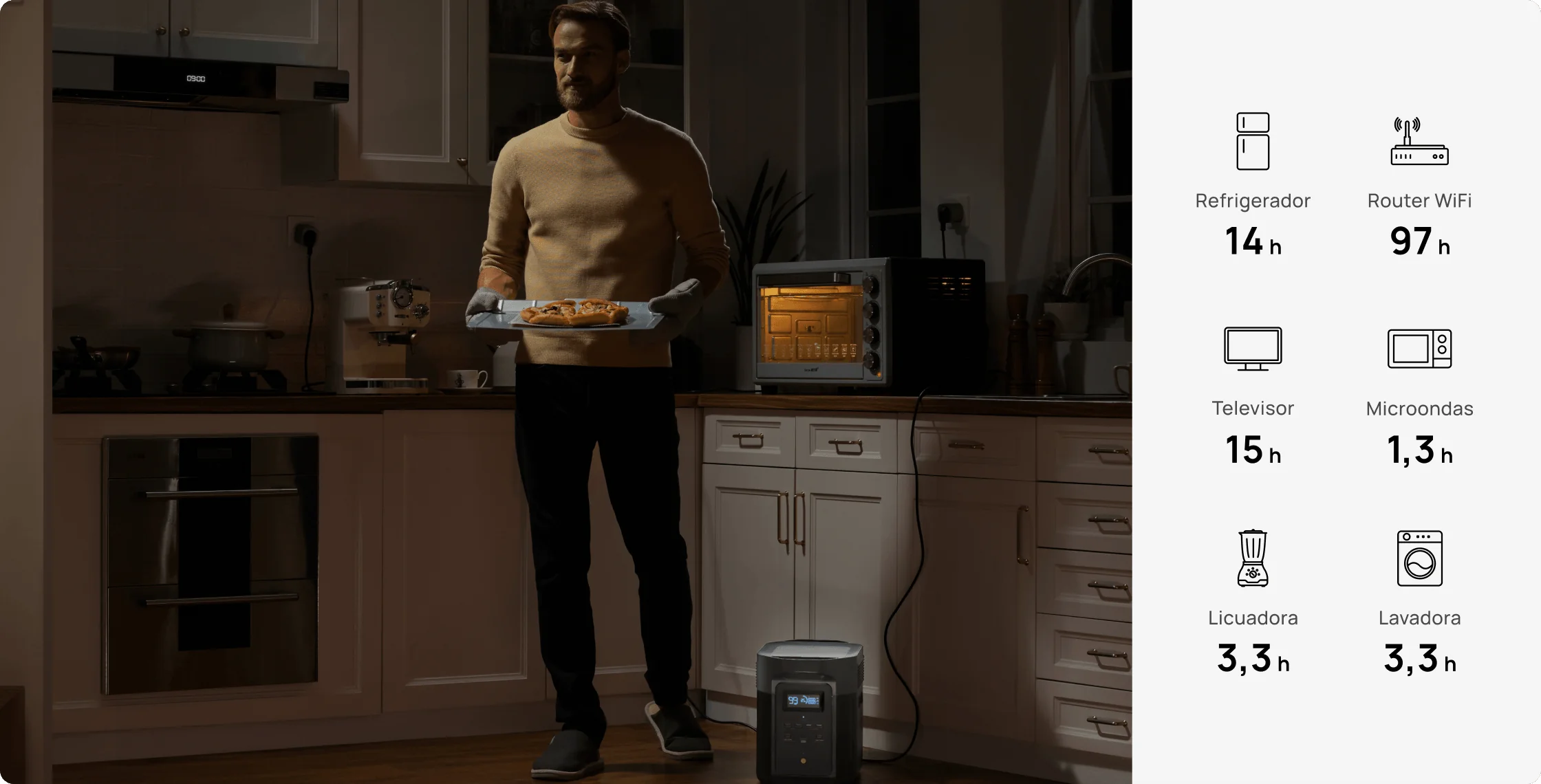 Una generosa capacidad de 2048 Wh hace que el DELTA 2 Max sea ideal para energía de reserva en el hogar y hacer funcionar los equipos esenciales durante horas. Con su interruptor de transferencia, o enchufado directamente, mantenga su refrigerador encendido y evite que los alimentos se echen a perder durante hasta 14 horas. Con su diseño ligero, podrá llevarse el DELTA 2 Max en su próxima acampada. * Datos basados en un refrigerador de 120 W.