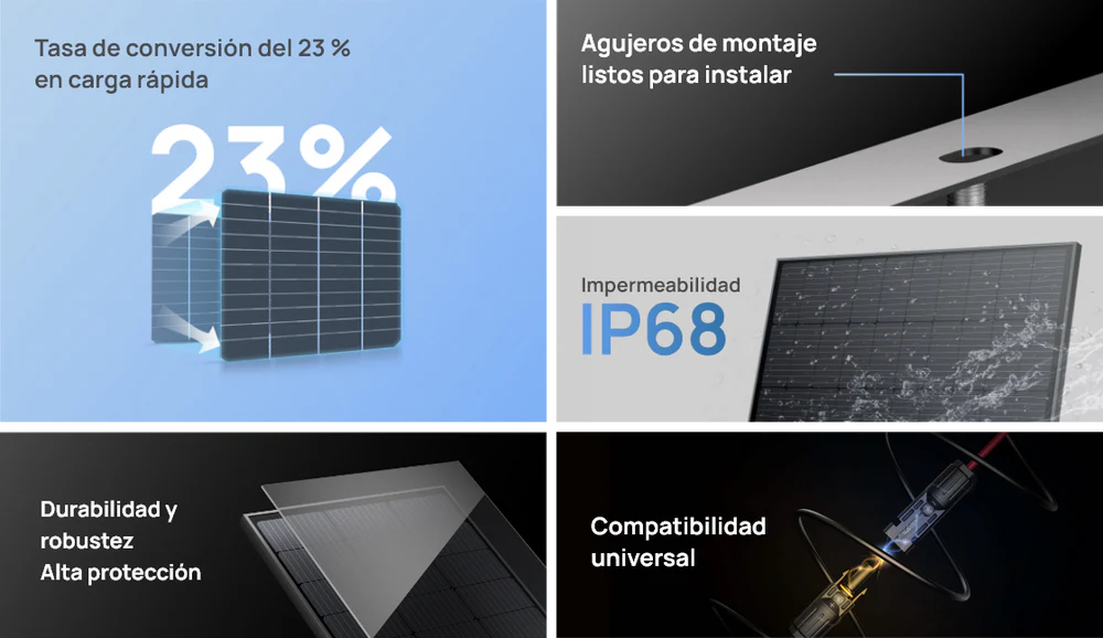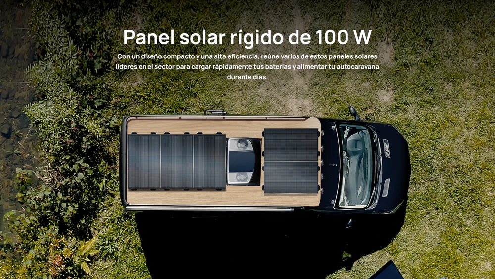 Dos unidades de paneles rigido de 100W creados a partir de células de silicio monocristalino eficientes e impermeables son capaces de cargar las estaciones de energía de la serie DELTA o RIVER, manteniendo su equipo funcionando fuera de la red.