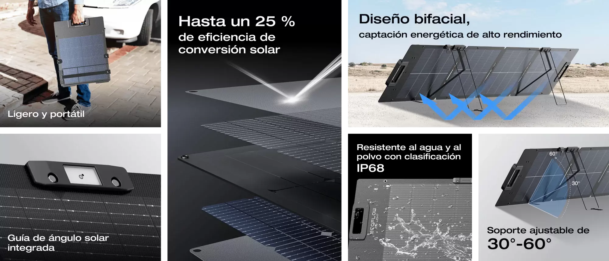 Diseñado para ser amigable con el ambiente, este panel solar ofrece una solución práctica y sostenible, capaz de conectarse fácilmente a una estación de energía portátil o a un controlador de carga mediante su adaptador. Además, su diseño bifacial permite captar energía por ambas caras para maximizar el rendimiento. Incluye soportes que facilitan su uso en diferentes superficies, un cable de conexión XT60 que garantiza una instalación segura y un cable de 2.4 metros que brinda mayor flexibilidad y comodidad.